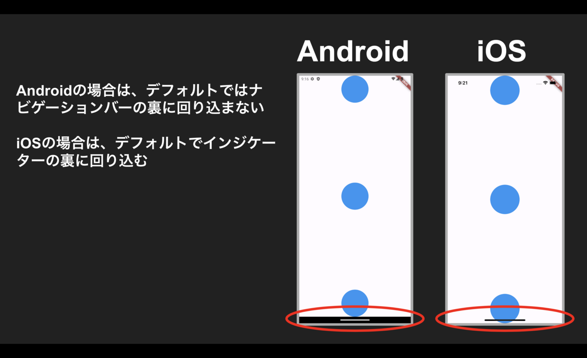 iOS/Androidともに、デフォルト状態でステータスバーの裏に円が回り込んでいるのがわかります。ですが、iOSではホームインジケーターの裏に円が回り込んでいるのに対して、Androidでは回り込んでいません。
