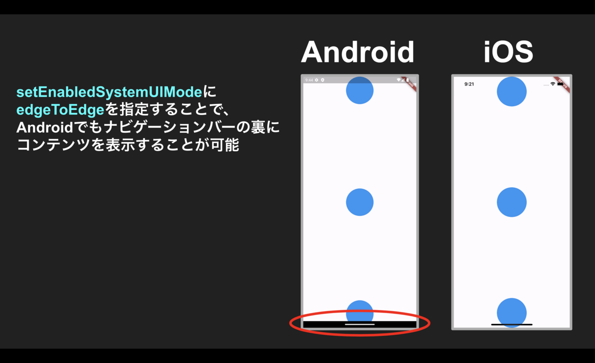 Androidでナビゲーションバーの裏にコンテンツを表示するには、SystemChromeクラスのsetEnabledSystemUIModeを利用します。