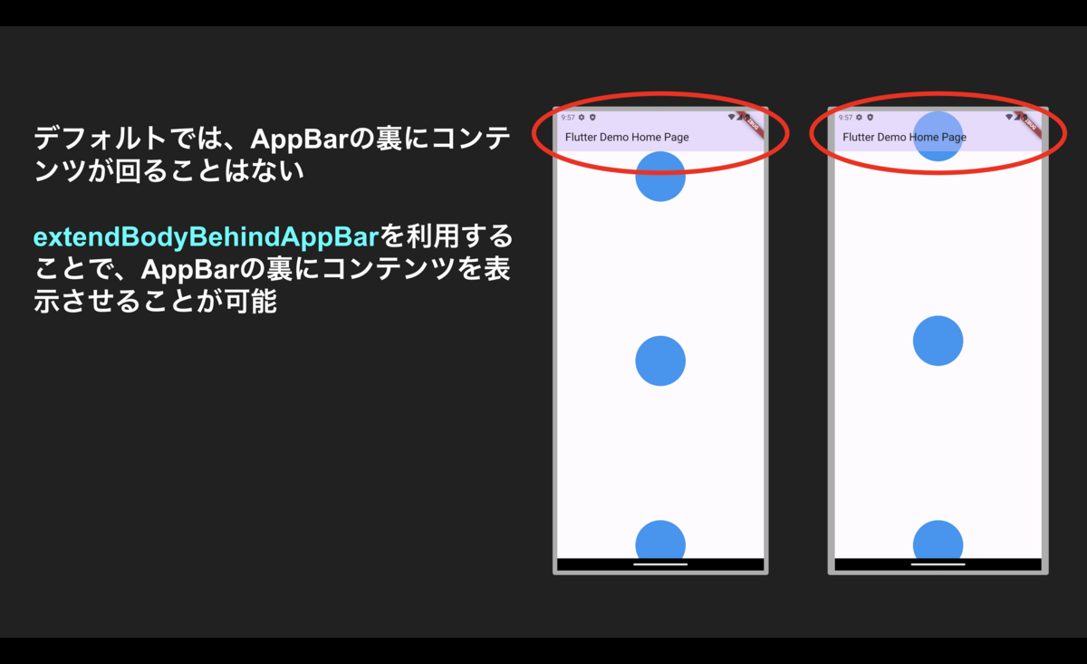 こうすることで、AppBarの裏にコンテンツを表示することができました。これで画面全体にコンテンツを表示することができました。