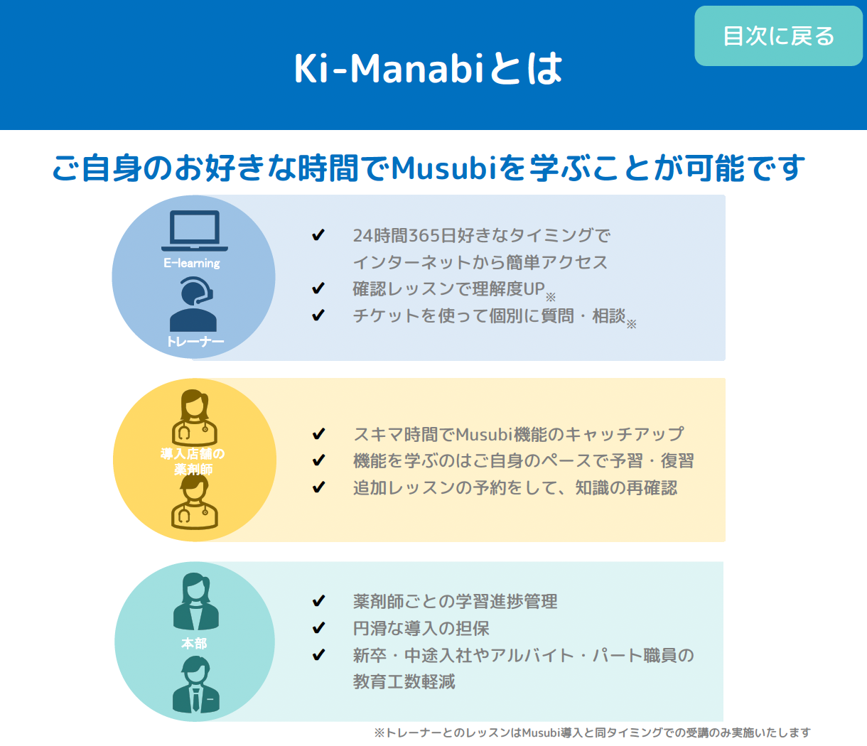 こちらはカケハシが提供しているMusubiを導入いただく調剤薬局さま向けに提供されているOJTプログラム「Ki-Manabi」です。カケハシ大学での受講プログラムの一部になっています。