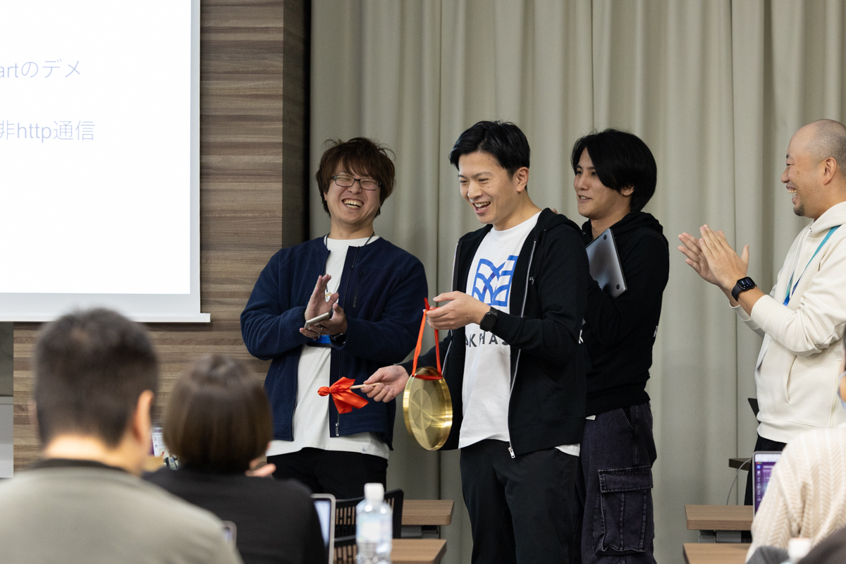 社内イベントでLTの銅鑼パーソンを担当してくださったCTO、みんな笑顔で最高ですね!